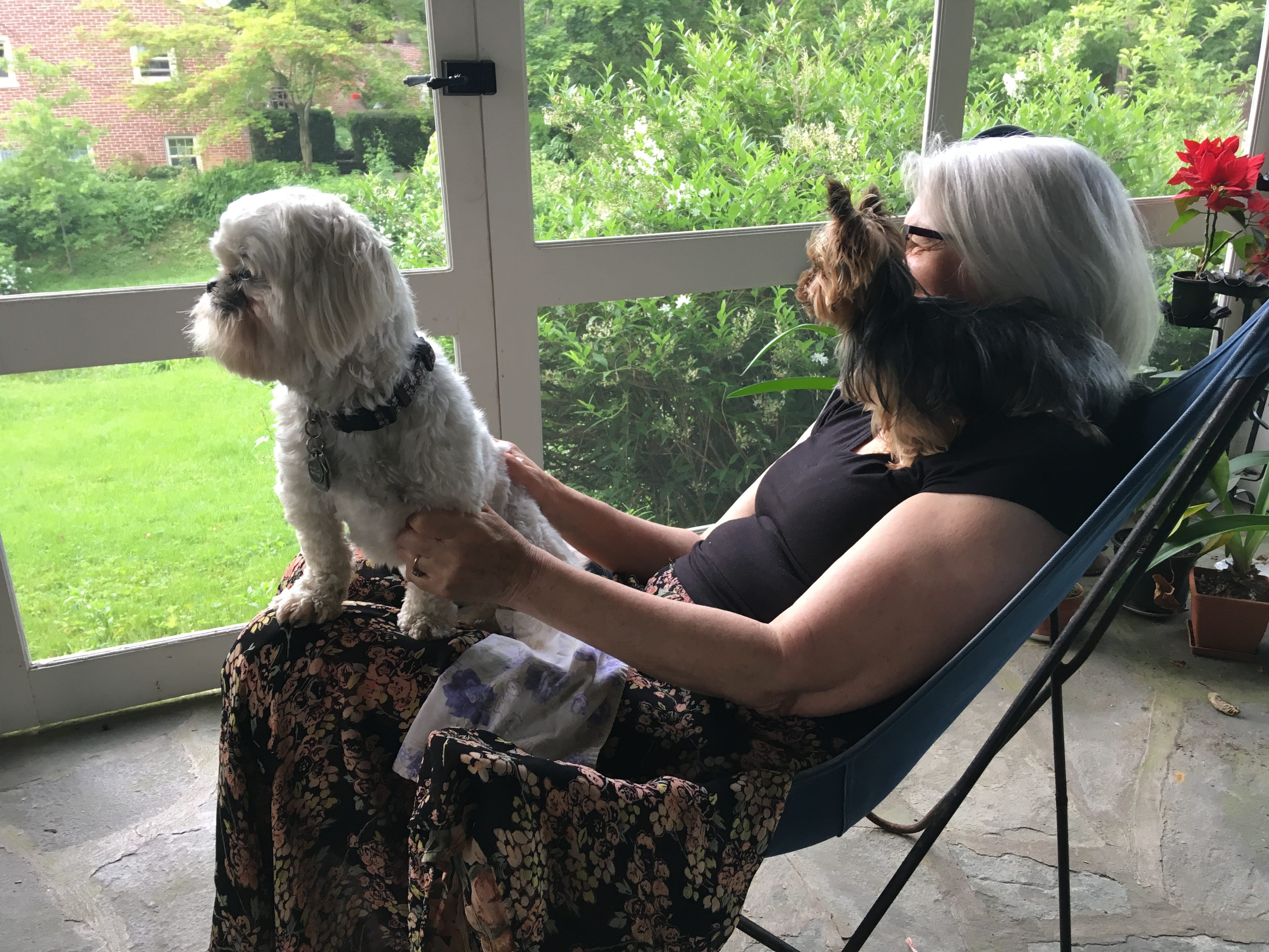I open up the side porch, and sweep up all the winter dirt. The dogs and I sit in the sun, listening. Isabela, hopeful that she can magically transport herself next to the rabbit on the lawn, thrills an undertone growl and pants.