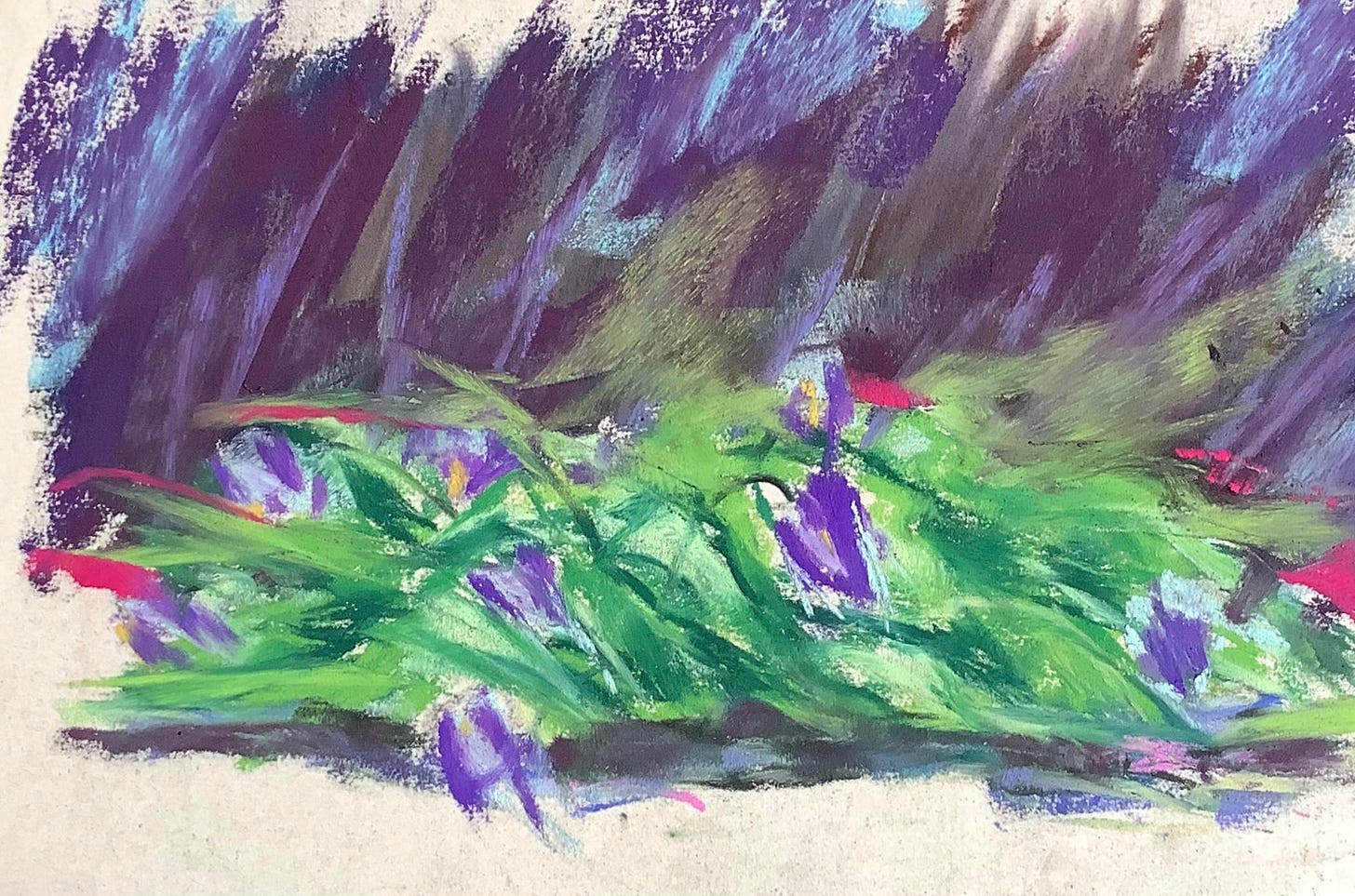 Pastels take me out to my garden, or into a dense wood. I move away from an accurate depiction towards capturing energy or motion. Even as the fall leaves are released downwards, my sense is upward. I want to see into the interior, the between. Holding the intensity of color between my finger tips, soft and delicate medium. Pure color. Direct color.